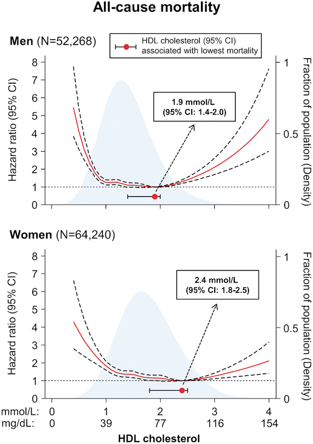 Pendant cette période, plus de 10.000 participants sont décédés. Une fois les données analysées, les chercheurs ont trouvé quelque chose de très intéressant. La courbe de corrélation entre le taux de HDL et la mortalité avait une forme de U. Cela signifie que les personnes avec un taux extrêmement élevé ou extrêmement faible avaient plus de chance de mourir.